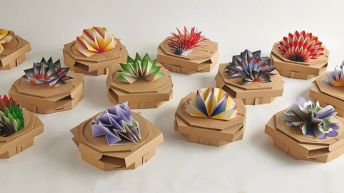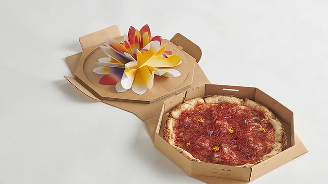 初看起來(lái) ,這些 盒子 并不奇怪 ,它們 都是 用硬紙板 做的,沒(méi)有什么 特別 的設(shè)計(jì) 。 盒子 一打開(kāi) ,才能 看到 真正 的“珍寶”。 該片 的主角 是和平 披薩 ,紙板 蓋上寫(xiě)著促進(jìn)和平的訊息 ,盒蓋 被分成 兩半 ,在翻開(kāi)左邊后,出現(xiàn)了令人驚嘆 的紙花 圖案 ,每一朵都代表 沖突 國(guó)家 的國(guó)旗 顏色 。